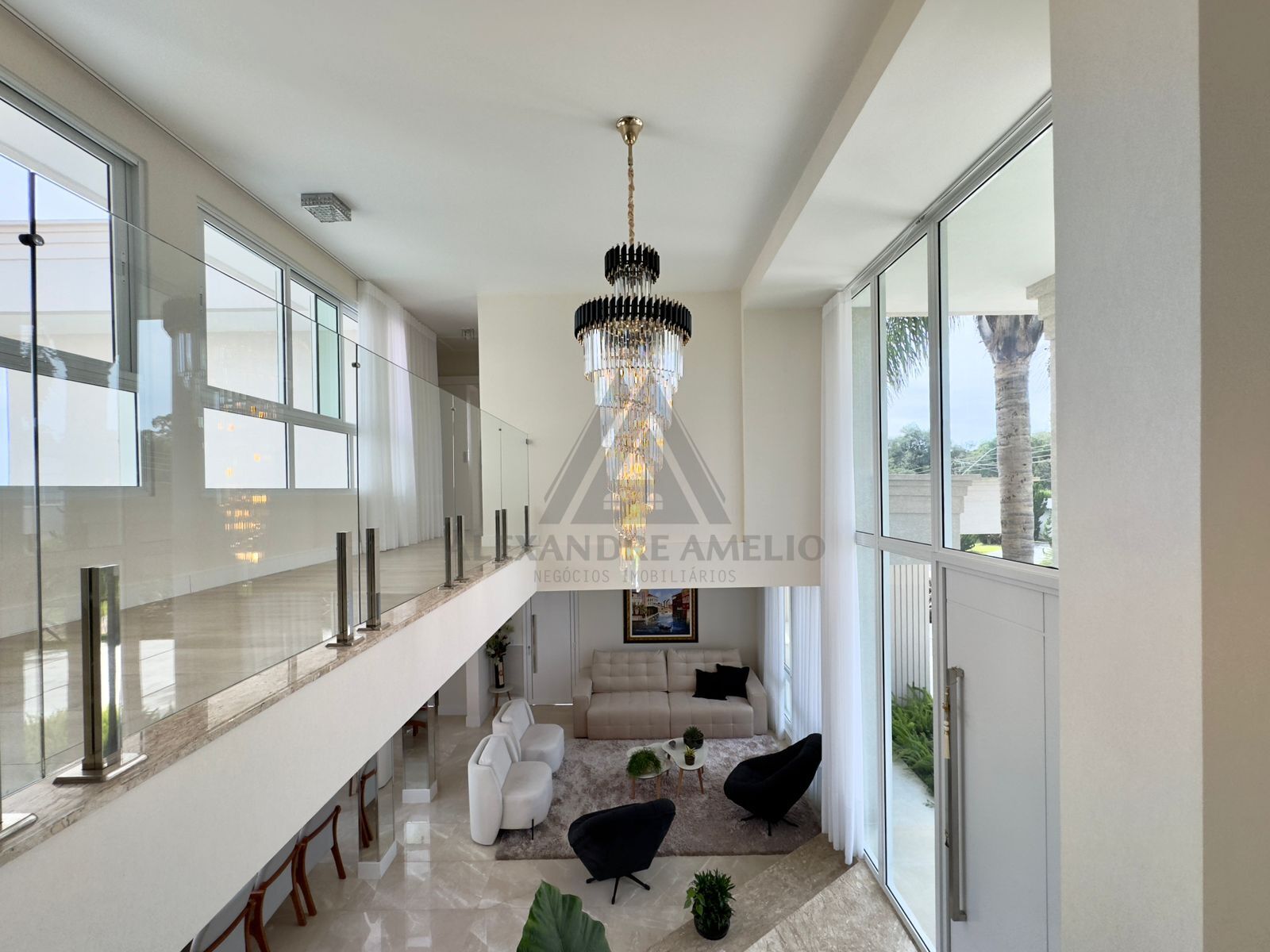 • Sala de estar com pé-direito alto e teto de vidro